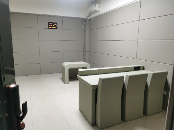 審訊室面積為15-30平方,一般設置2臺全景攝像頭及1臺特寫攝像頭,1臺在線視頻系統(tǒng),通過聯網服務器進行遠程指揮及同步錄音攝像,房間內配備示證視頻系統(tǒng)。配備辦公和談話桌椅,辦公和審訊桌椅均采用軟質包覆,無安全隱患,配備多媒體排口系統(tǒng),方便辦公人員的電器設備,及視頻系統(tǒng)?!檫M一步防止被審訊人的人身安全,以頭撞墻產生以外,墻面應用厚度大于2cm阻燃防撞軟體材料進行覆蓋,絕對不允許意外事件的發(fā)生。室內電器設備安裝不規(guī)范有可能導致意外事件的發(fā)生。因此室內所有的電器設備的電源插座,開關都建議采用集中控制的方式,由電腦控制開關,手動控制器和集線箱應安裝在過道或監(jiān)控房內。為防止意外事件的發(fā)生,不建議使用公共衛(wèi)生間給被談話人使用。所以每間房間必須有獨立的衛(wèi)生間,所有馬桶及洗手盆必須軟包處理,并安裝隱蔽攝像頭。